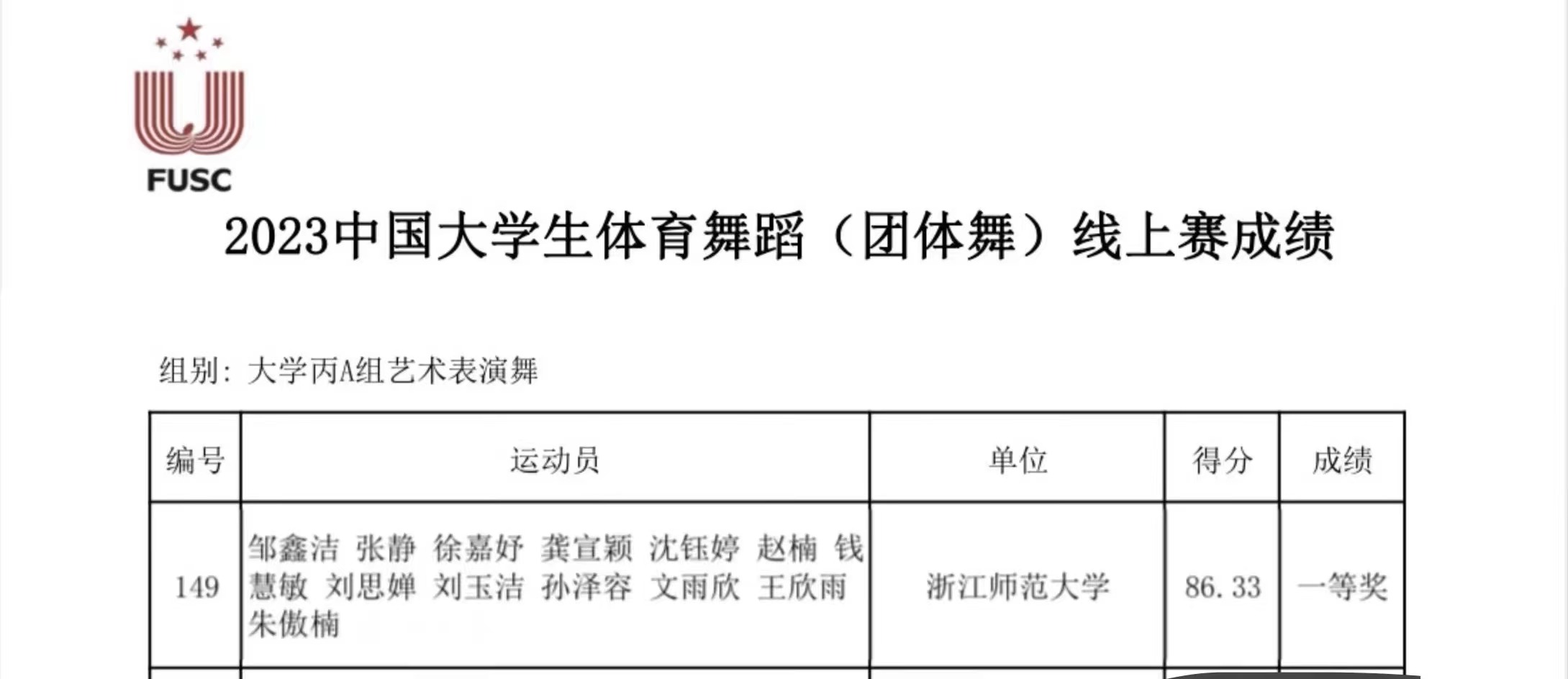 2023年12月,中国大学生体育舞蹈(团体赛)线上赛顺利落下帷幕。姜小平老师带领的beat365在线唯一官网体育舞蹈队以86.33的最终得分获得大学丙A组艺术表演舞全国一等奖。